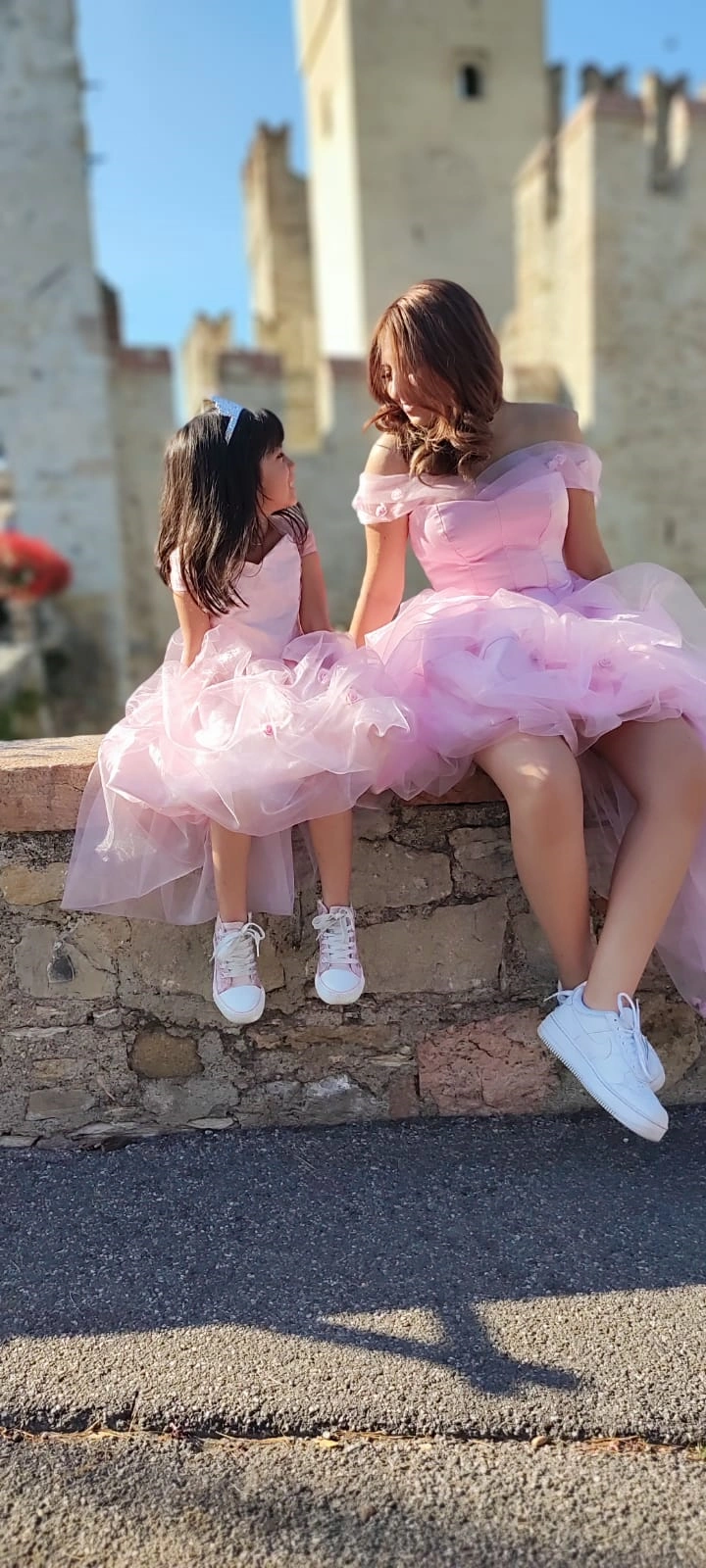 Questo elegante abito da cerimonia è confezionato in organza e raso di seta, materiali pregiati che donano leggerezza e lucentezza al capo. La chiusura con stringhe e cordoncino sul retro, insieme alla pratica cerniera, garantisce una perfetta vestibilità e un tocco di raffinatezza.
