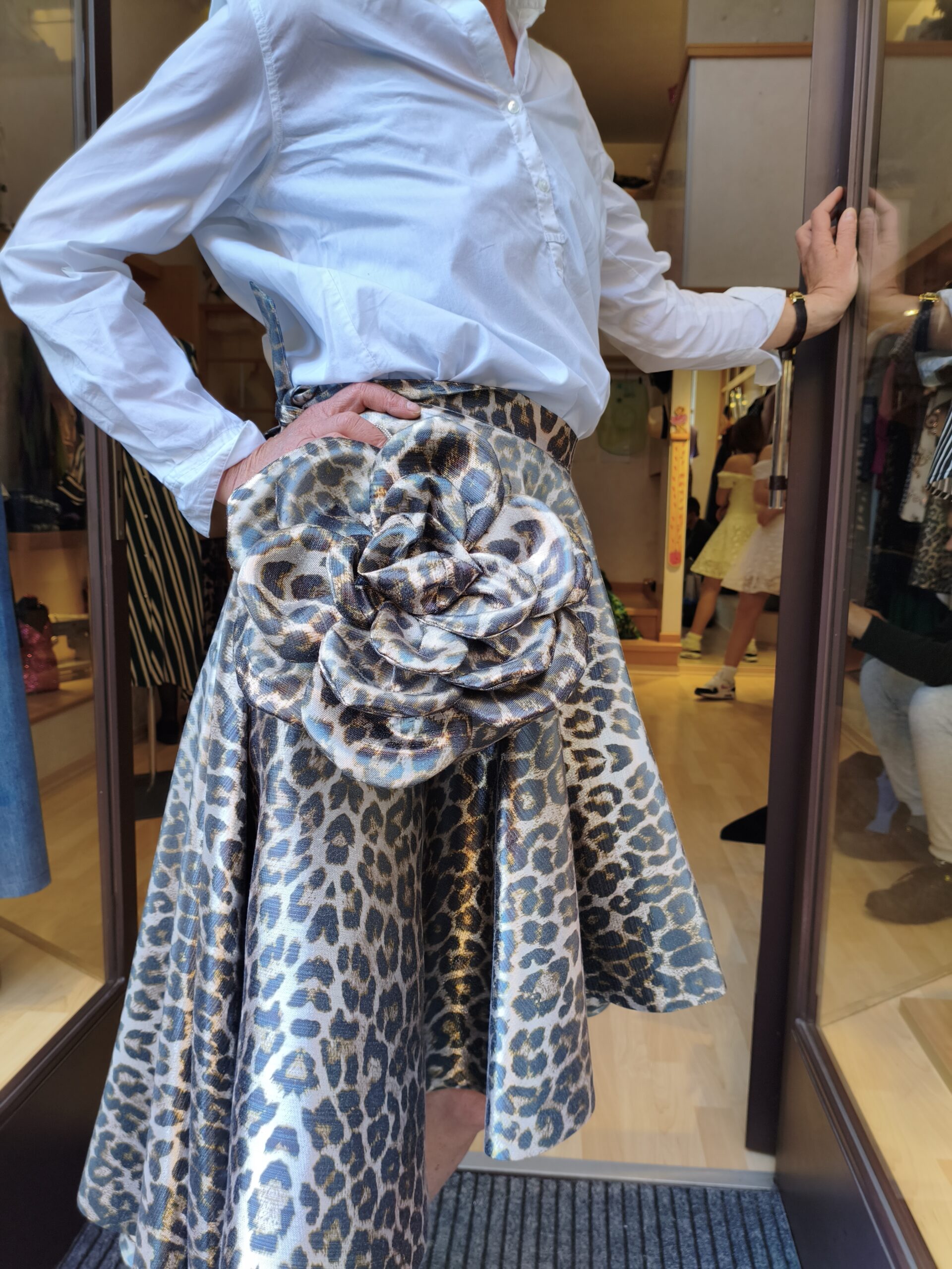 Gonna midi a vita alta con stampa leopardata, realizzata in tessuto fluido per un look audace e sofisticato.