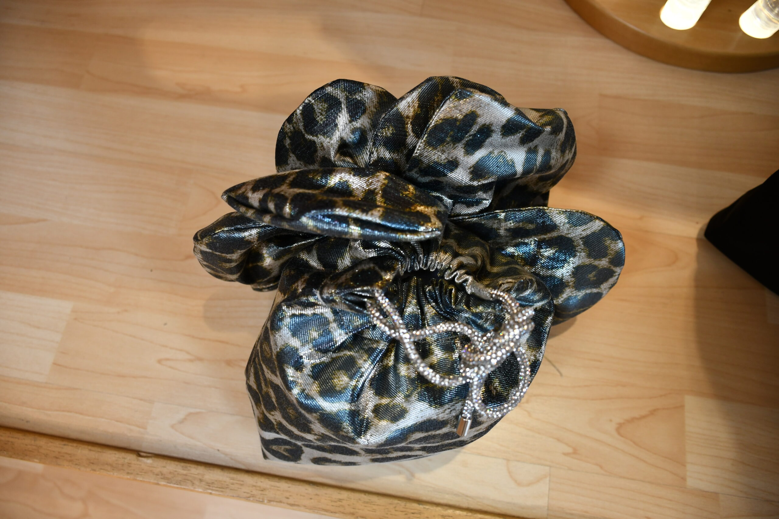 Pochette maculata in raso con chiusura a coulisse, doppio manico e tracolla. Eleganza grintosa per ogni occasione.
